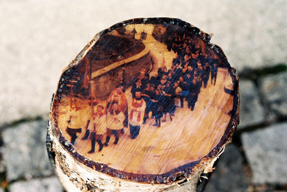 Für die „REFLEKTORZONE“ werden in jedes vorhandene Montageloch rohe Birkenstämme als Straßenpfeiler gesteckt: ausgerüstet mit richtungsweisenden rot/weißen Reflektoren. Die Stirnholzseiten weisen jeweils ein Fotomotiv diverser Umzüge als Kunststoffcopytransfer auf und werden so quasi zu reflexiven Bildstationen – traditionelles Fortschreiten und automobiles Fortfahren entlang von Säulen begrenzender Ordnung und Musterbildern dorfgemeinschaft-licher Aktivität mit staatsfarbenen Lichteffekten bei Nacht.